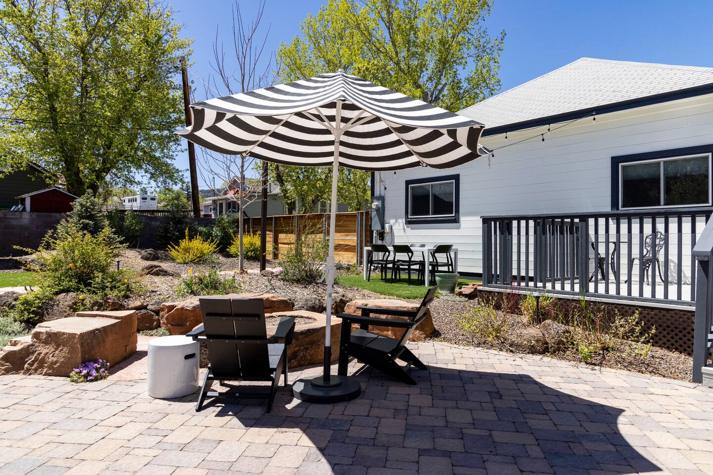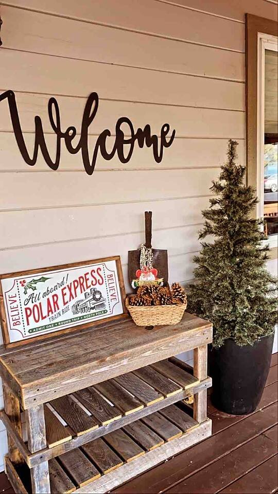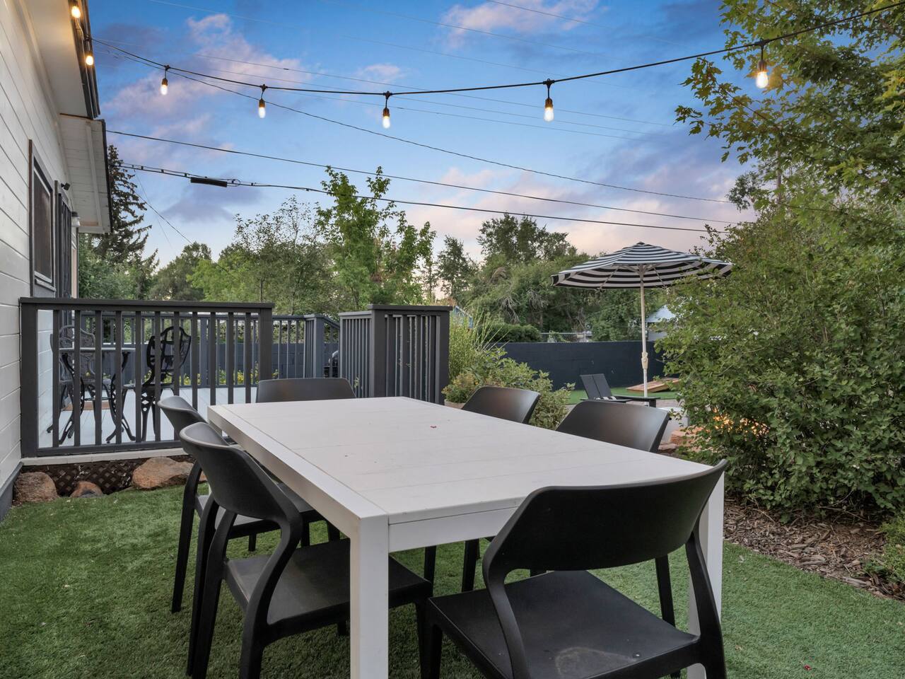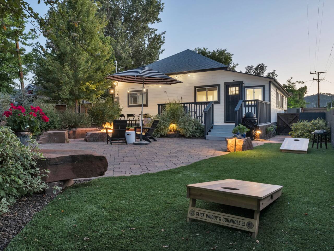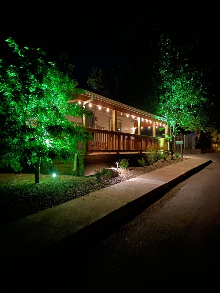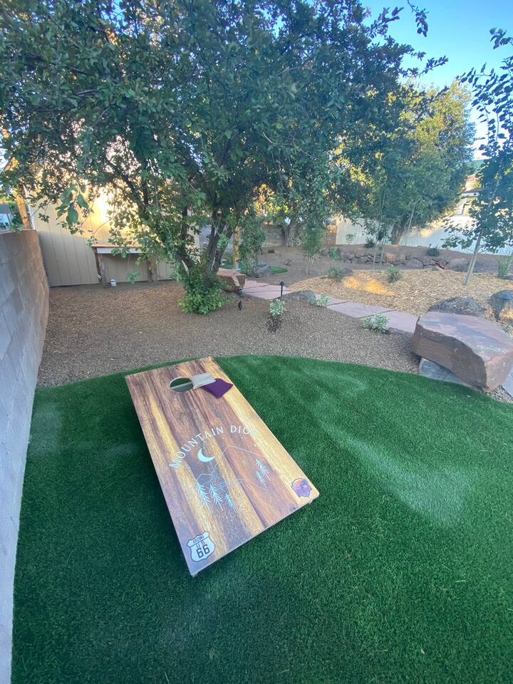 The stunning back yard is the star of this homestead. Completely revamped in 2020, the natural stone patio extends the living and entertaining space. A custom fire pit built into a rock boulder is the heart of this outdoor oasis. It is flanked by more natural boulder benches, a regulation sized corn hole court, outdoor dining area and so much more. Ambient lighting allows you to celebrate from day into night watching the star-filled nights of Arizona skies. We furnished this home in the coziest way possible and to be honest, it makes me feel like moving back to Arizona and moving in. It has great energy and is oh-so comfortable. I like to call the style mountain bohemian or boho chic. You could easily call it comfortable and cozy, spacious and serene, or family friendly. Located two short blocks from Route 66, you can walk to historic downtown Williams where you can dine and shop in the charming downtown. It's even walking distance to the Grand Canyon Railway. Mountain Digs was completely remodeled in 2019 with lots of room to spread out and enjoy your time in beautiful Northern Arizona. In addition to three bedrooms and two full bathrooms, it features large family and dining rooms. The large day bed in the living room includes a twin sized mattress and is super comfy for sleeping. The split floor plan allows great privacy for two couples who may be traveling together. The large living area is open to a beautiful dining and lounge area, great place to enjoy cocktails before dinner or morning coffee as you awaken to the cool pines of Northern Arizona. The front porch is beautifully inviting with a cushy outdoor sofa and occasional chairs. There's plenty of on-site parking, including space for an RV or Motor Home. Creating a mountain retreat for guests to love has been a passion project. We have spared no expense in making your stay away from home spectacular. We can’t wait to welcome you to our “nest of rest for those traveling west.”