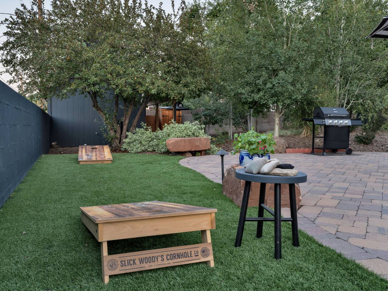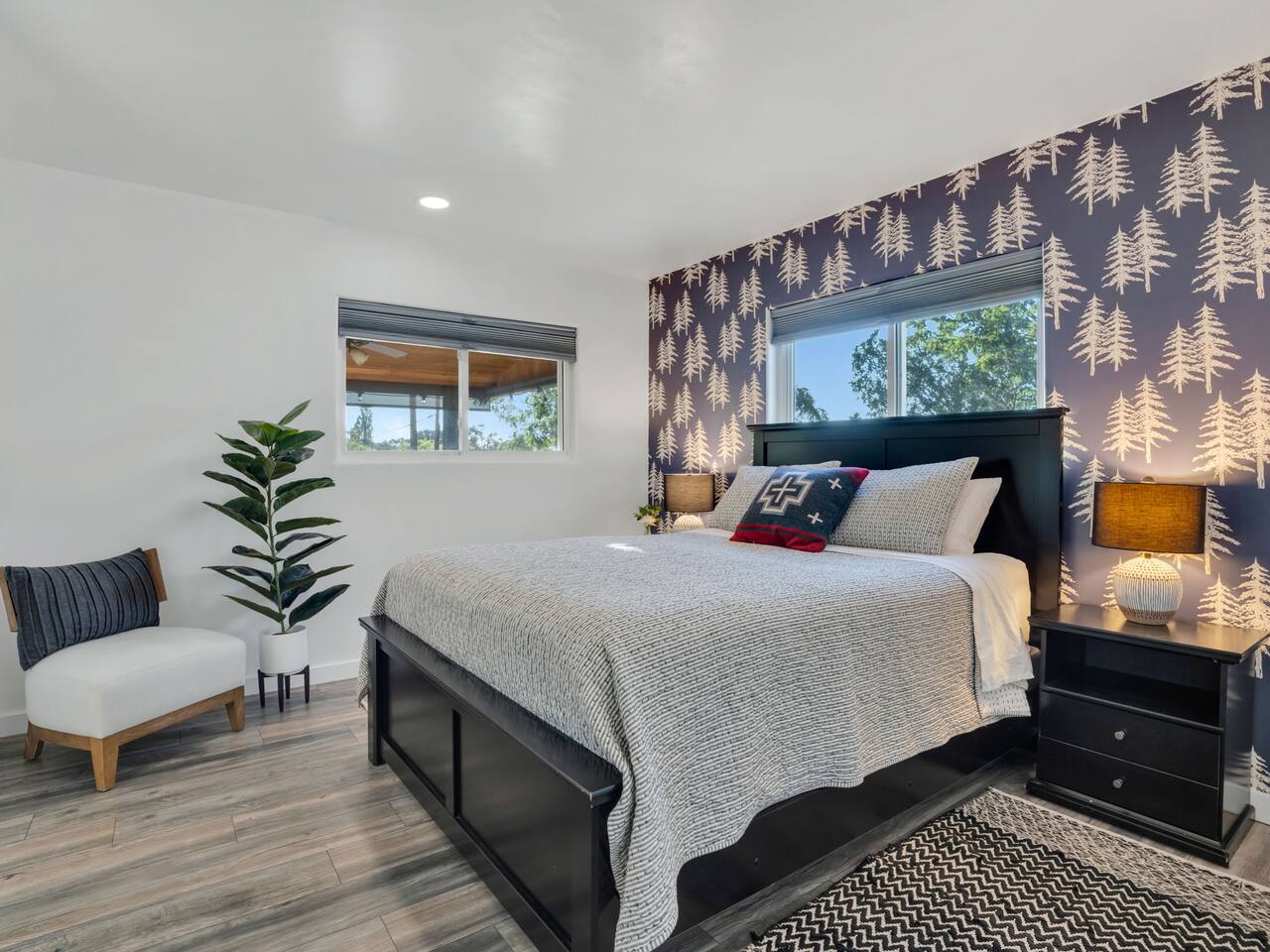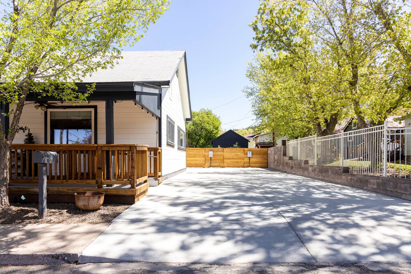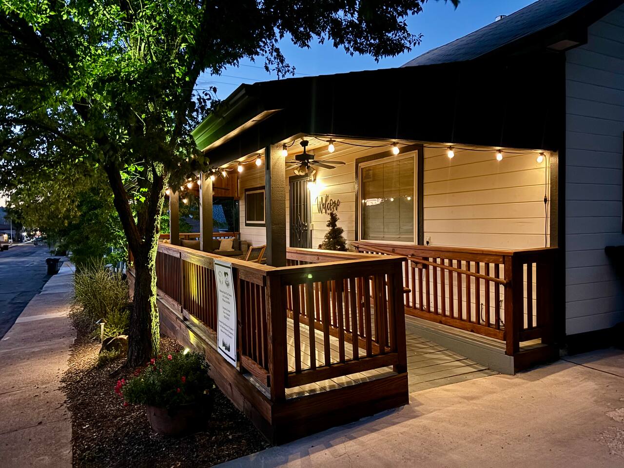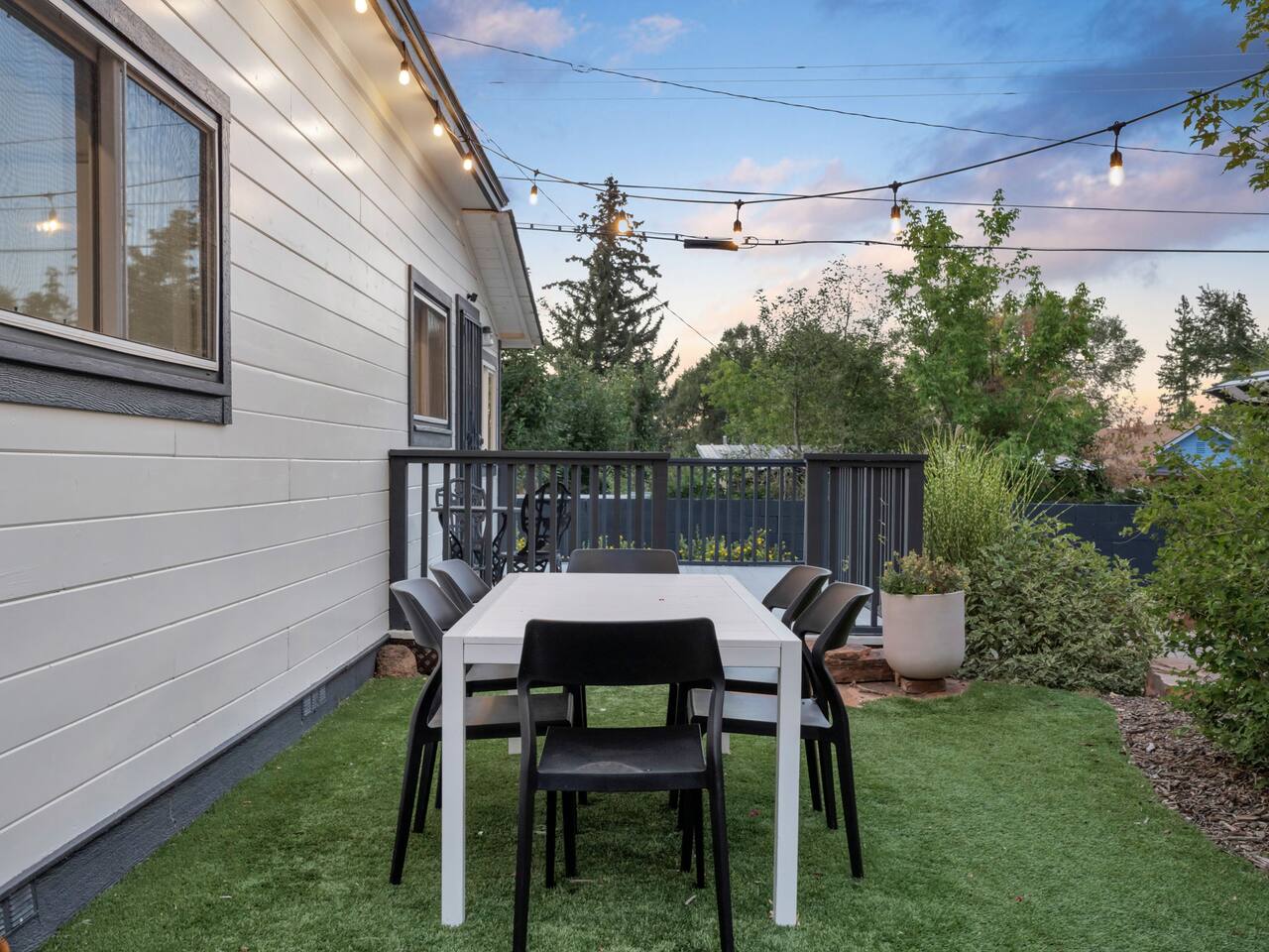 The stunning back yard is the star of this homestead. Completely revamped in 2020, the natural stone patio extends the living and entertaining space. A custom fire pit built into a rock boulder is the heart of this outdoor oasis. It is flanked by more natural boulder benches, a regulation sized corn hole court, outdoor dining area and so much more. Ambient lighting allows you to celebrate from day into night watching the star-filled nights of Arizona skies. We furnished this home in the coziest way possible and to be honest, it makes me feel like moving back to Arizona and moving in. It has great energy and is oh-so comfortable. I like to call the style mountain bohemian or boho chic. You could easily call it comfortable and cozy, spacious and serene, or family friendly. Located two short blocks from Route 66, you can walk to historic downtown Williams where you can dine and shop in the charming downtown. It's even walking distance to the Grand Canyon Railway. Mountain Digs was completely remodeled in 2019 with lots of room to spread out and enjoy your time in beautiful Northern Arizona. In addition to three bedrooms and two full bathrooms, it features large family and dining rooms. The large day bed in the living room includes a twin sized mattress and is super comfy for sleeping. The split floor plan allows great privacy for two couples who may be traveling together. The large living area is open to a beautiful dining and lounge area, great place to enjoy cocktails before dinner or morning coffee as you awaken to the cool pines of Northern Arizona. The front porch is beautifully inviting with a cushy outdoor sofa and occasional chairs. There's plenty of on-site parking, including space for an RV or Motor Home. Creating a mountain retreat for guests to love has been a passion project. We have spared no expense in making your stay away from home spectacular. We can’t wait to welcome you to our “nest of rest for those traveling west.”