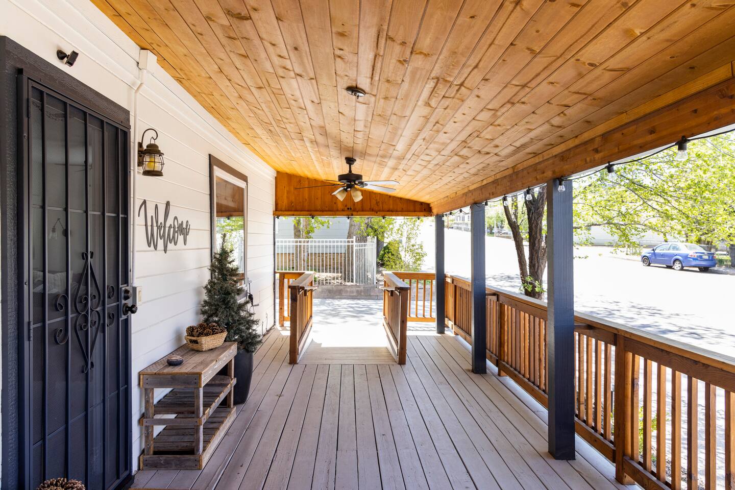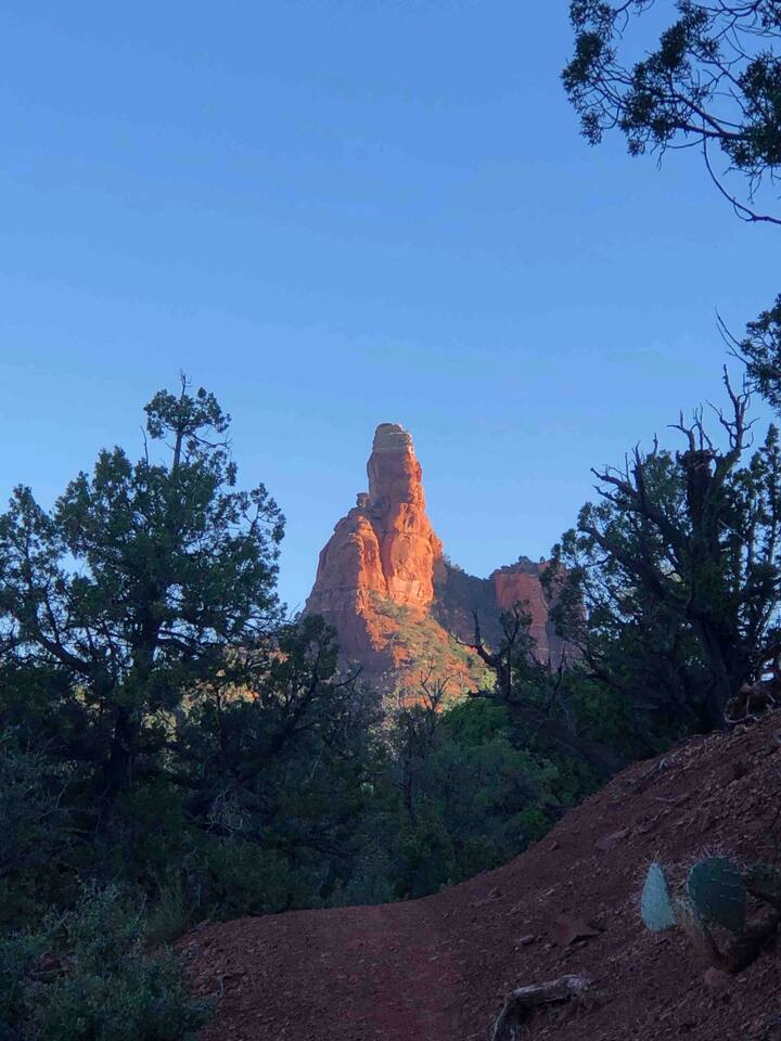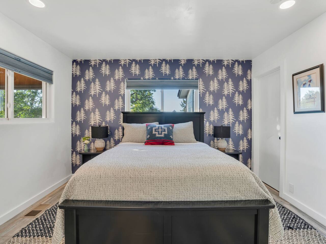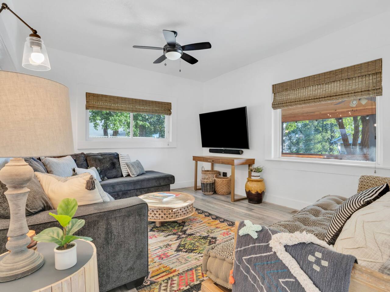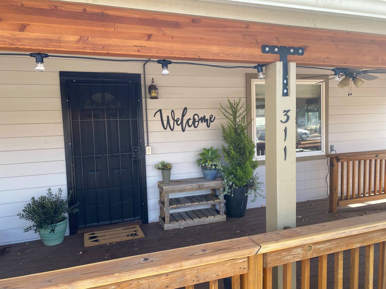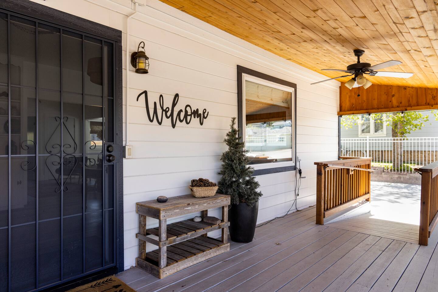 The stunning back yard is the star of this homestead. Completely revamped in 2020, the natural stone patio extends the living and entertaining space. A custom fire pit built into a rock boulder is the heart of this outdoor oasis. It is flanked by more natural boulder benches, a regulation sized corn hole court, outdoor dining area and so much more. Ambient lighting allows you to celebrate from day into night watching the star-filled nights of Arizona skies. We furnished this home in the coziest way possible and to be honest, it makes me feel like moving back to Arizona and moving in. It has great energy and is oh-so comfortable. I like to call the style mountain bohemian or boho chic. You could easily call it comfortable and cozy, spacious and serene, or family friendly. Located two short blocks from Route 66, you can walk to historic downtown Williams where you can dine and shop in the charming downtown. It's even walking distance to the Grand Canyon Railway. Mountain Digs was completely remodeled in 2019 with lots of room to spread out and enjoy your time in beautiful Northern Arizona. In addition to three bedrooms and two full bathrooms, it features large family and dining rooms. The large day bed in the living room includes a twin sized mattress and is super comfy for sleeping. The split floor plan allows great privacy for two couples who may be traveling together. The large living area is open to a beautiful dining and lounge area, great place to enjoy cocktails before dinner or morning coffee as you awaken to the cool pines of Northern Arizona. The front porch is beautifully inviting with a cushy outdoor sofa and occasional chairs. There's plenty of on-site parking, including space for an RV or Motor Home. Creating a mountain retreat for guests to love has been a passion project. We have spared no expense in making your stay away from home spectacular. We can’t wait to welcome you to our “nest of rest for those traveling west.”