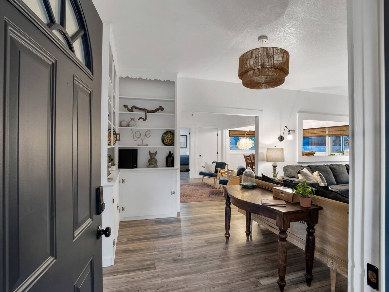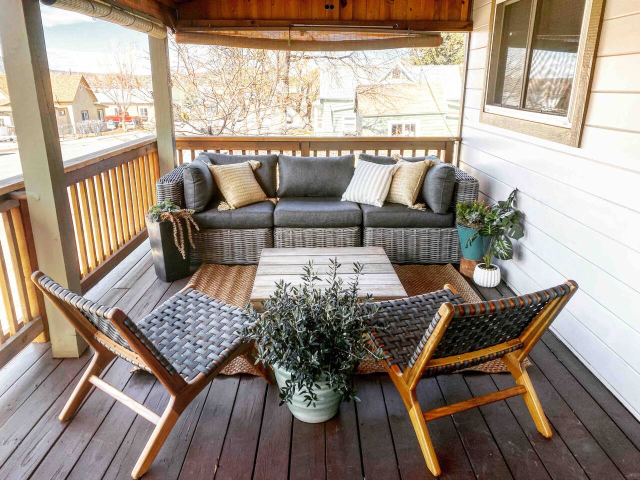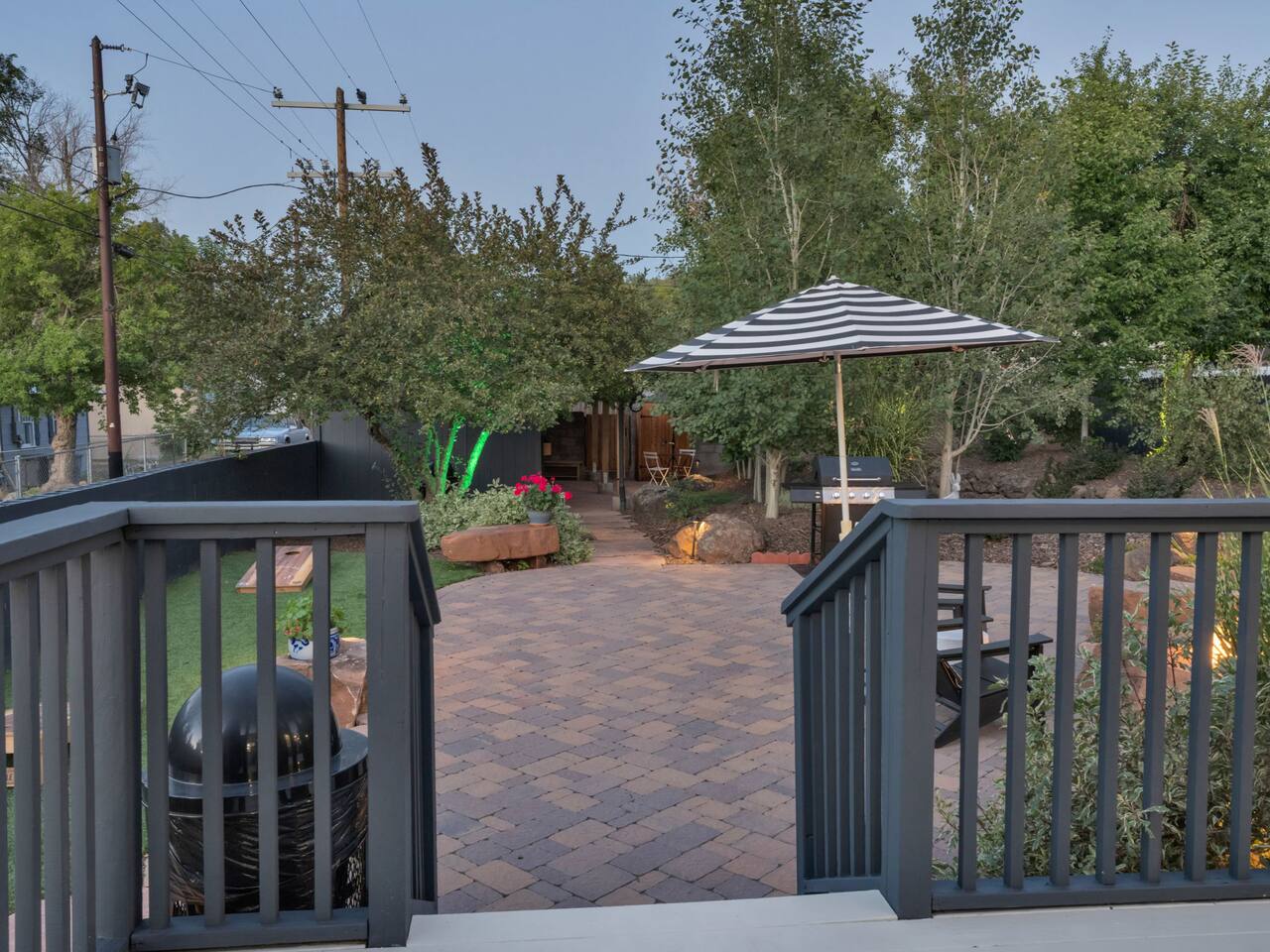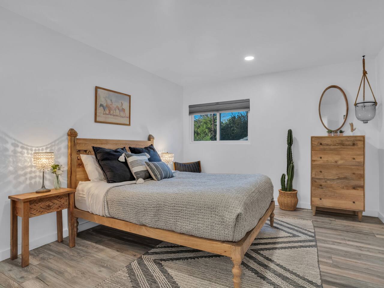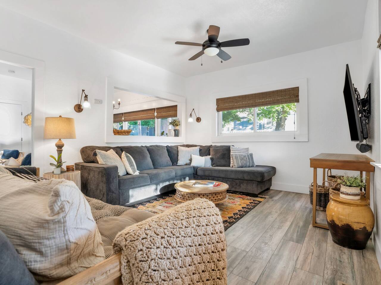 The stunning back yard is the star of this homestead. Completely revamped in 2020, the natural stone patio extends the living and entertaining space. A custom fire pit built into a rock boulder is the heart of this outdoor oasis. It is flanked by more natural boulder benches, a regulation sized corn hole court, outdoor dining area and so much more. Ambient lighting allows you to celebrate from day into night watching the star-filled nights of Arizona skies. We furnished this home in the coziest way possible and to be honest, it makes me feel like moving back to Arizona and moving in. It has great energy and is oh-so comfortable. I like to call the style mountain bohemian or boho chic. You could easily call it comfortable and cozy, spacious and serene, or family friendly. Located two short blocks from Route 66, you can walk to historic downtown Williams where you can dine and shop in the charming downtown. It's even walking distance to the Grand Canyon Railway. Mountain Digs was completely remodeled in 2019 with lots of room to spread out and enjoy your time in beautiful Northern Arizona. In addition to three bedrooms and two full bathrooms, it features large family and dining rooms. The large day bed in the living room includes a twin sized mattress and is super comfy for sleeping. The split floor plan allows great privacy for two couples who may be traveling together. The large living area is open to a beautiful dining and lounge area, great place to enjoy cocktails before dinner or morning coffee as you awaken to the cool pines of Northern Arizona. The front porch is beautifully inviting with a cushy outdoor sofa and occasional chairs. There's plenty of on-site parking, including space for an RV or Motor Home. Creating a mountain retreat for guests to love has been a passion project. We have spared no expense in making your stay away from home spectacular. We can’t wait to welcome you to our “nest of rest for those traveling west.”