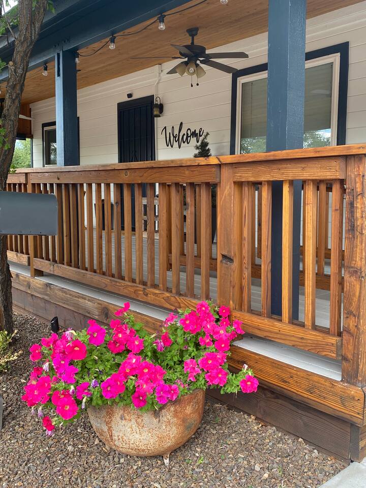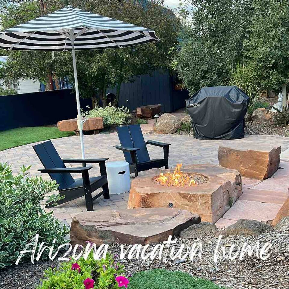 Oh Em Gee! This home is ah-mazing! Walking distance to historic Route 66, close to the Grand Canyon, Sedona and so much more. There are two homes on this large property...book both homes for up to 9 guests. Each home has a private fire pit for privacy. The open floor plan was designed for the ultimate in entertaining. Enjoy cocktails at sunset on the beautiful veranda (extra large covered porch), or play a fun game of corn hole while bar b queuing in the spectacular back yard by the fire pit.